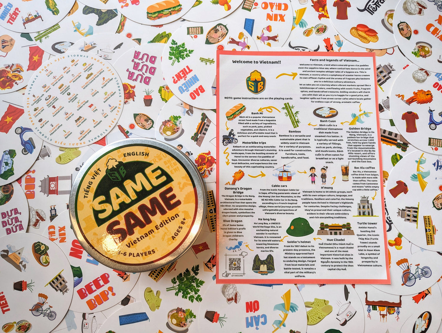 Same Same is a series of icon matching games inspired by local culture. The third installment to the series is Same Same: Vietnam Edition, a 57 card game populated by 57 iconic landmarks, cultural attractions and commonly used phrases in Vietnam.